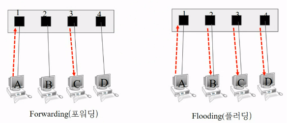- Flooding : 송신지 포트를 제외한 나머지 포트들로 트래픽 전송