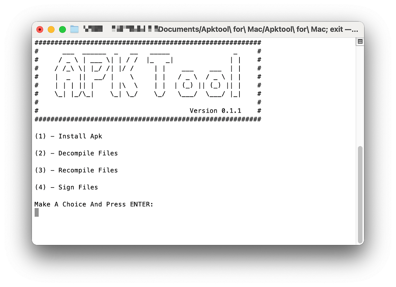하지만 macOS에는 APK Easy Tool과 같은 도구가 없어서 APK Tool을 이용하여 직접 명령어 입력하여 사용하였다.