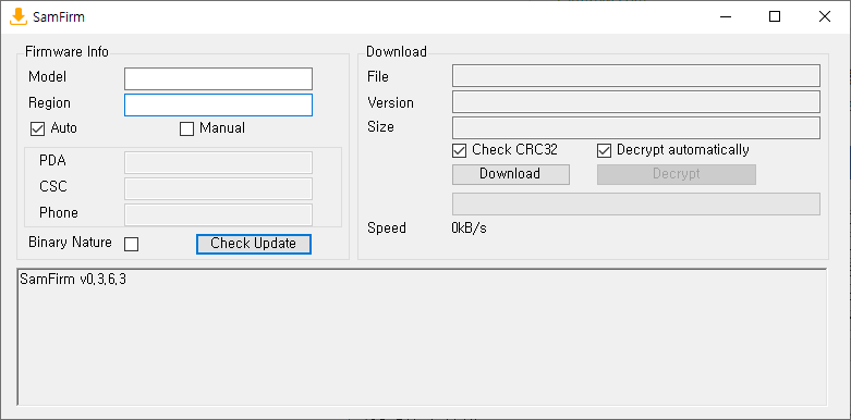 Samfirm을 실행하면 다음과 같이 실행되는데 Model에 Pull 모델명을 입력하고, Region은 SK라면 SKU, KT라면 KTC, LG라면 LUC 를 적어주고 Check Update를 실행하면 우측에 파일이 나타나게 되는데 아래 적혀있는 Download를 진행해주면 된다.