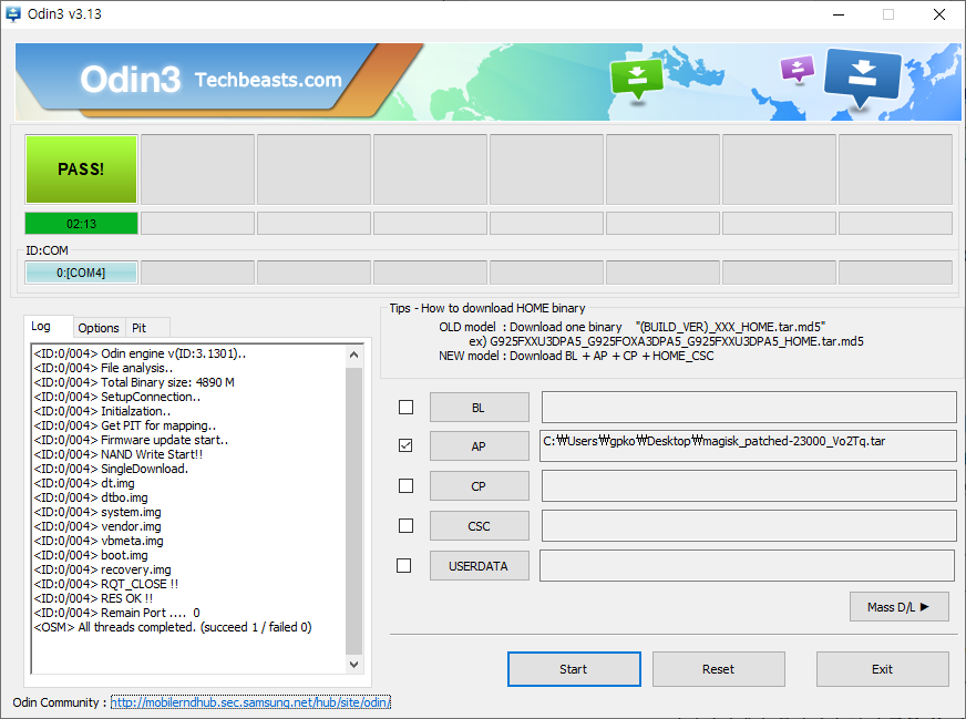 위 사진과 같이 PASS!가 됐다면 다운로드가 완료했다는 말이다. 이때 기기에서는 다운로드중... 이라는 글자가 뜬 상태로 있을 것이다. 이때 전원키와 볼륨(하)키를 동시에 둘러 다운로드 모드를 빠져나온다.