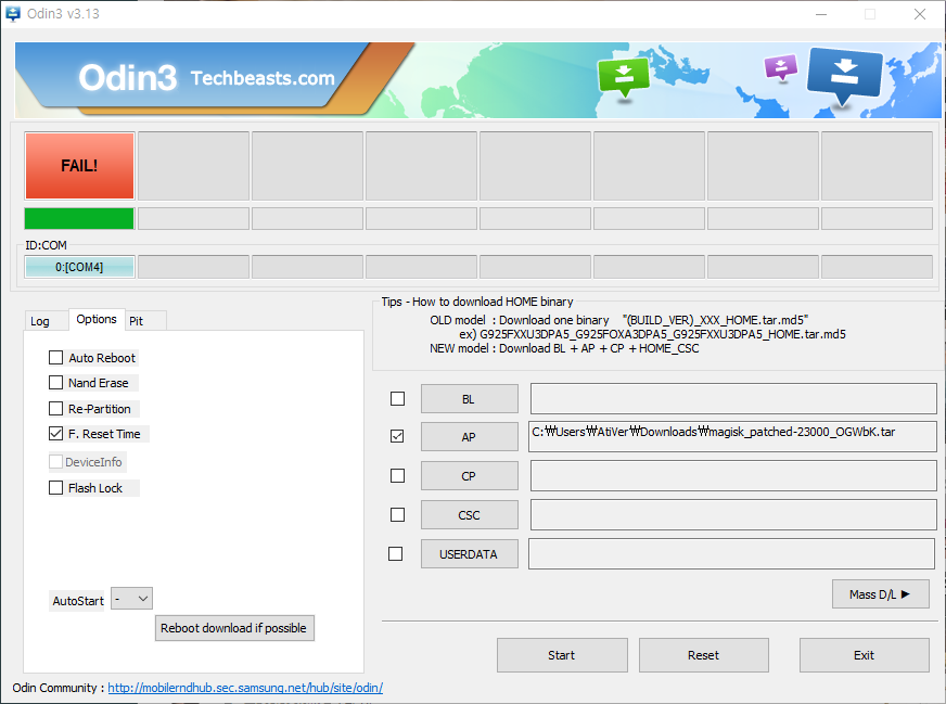 만약 다음 사진과 같이 FAIL이 나왔다면 다운로드 받았던 순정 펌웨어를 넣어주어 처음부터 다시 진행하면 된다.