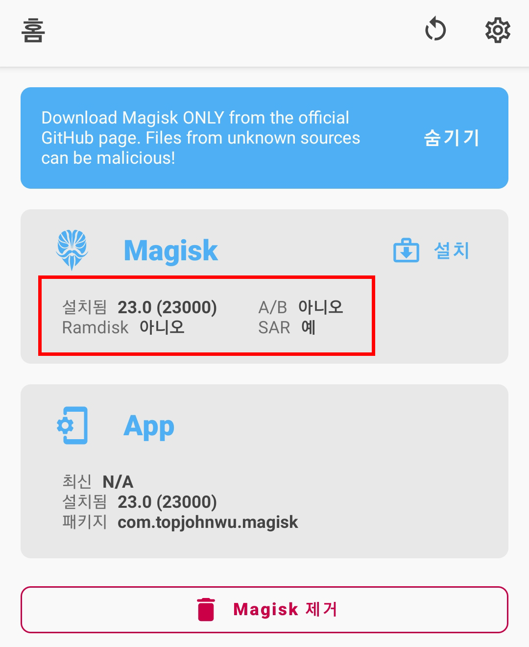 위 과정을 모두 완료하였다면, Magisk 앱을 실행시켜 다음과 같은 절차를 진행한다.